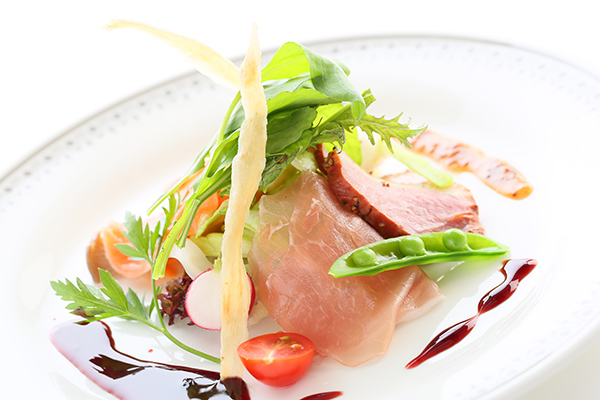 まろやかなサーモンのマリネと季節の魚のカルパッチョ、新鮮野菜の盛り合わせ。見た目も美しく二種のソースがからまった味のハーモニーが楽しめます。