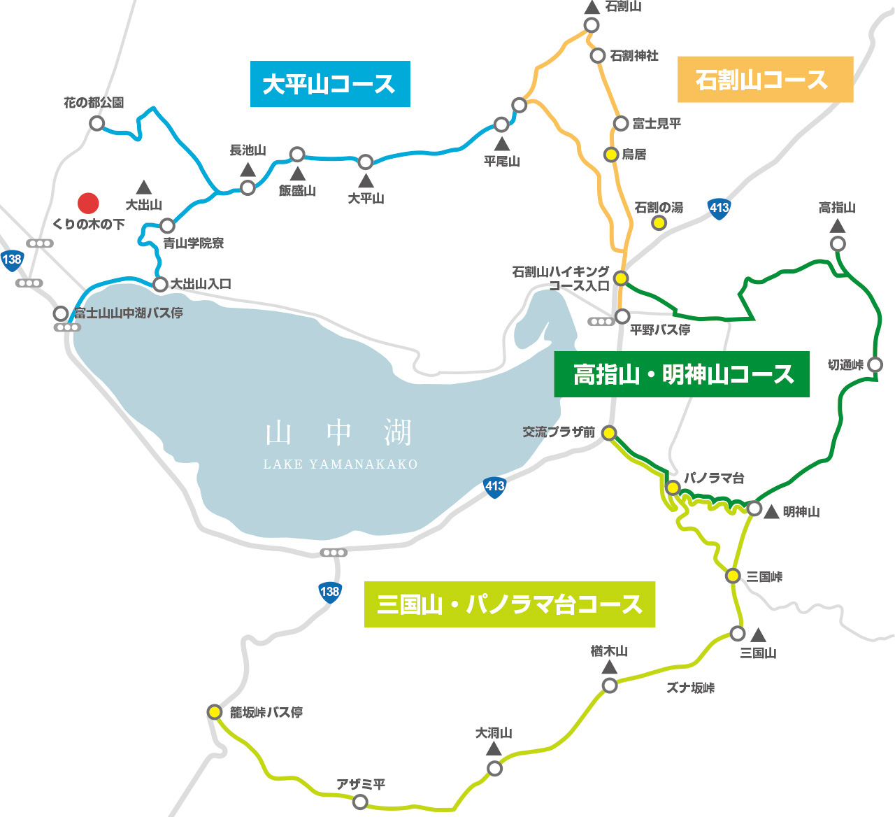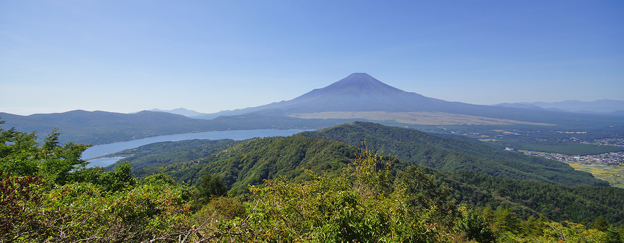 平野バス停から出発し、緩やかな山道を40分ほど登ると四阿のある富士見平に到着。さらに30分ほど進むと、巨岩が鎮座する石割神社。ここから山頂まではかなり急峻なコースとなる頑張りどころ。足元に露出した岩や木の根があり、注意が必要だが、滑りやすい場所にはロープが張ってあるので安心して登れる。約20分あまりで、周囲が突然開け、石割山山頂に到着。眼前に富士山、眼下に山中湖の絶景が広がり、疲れも吹き飛んでしまうほどの満足感が味わえる。