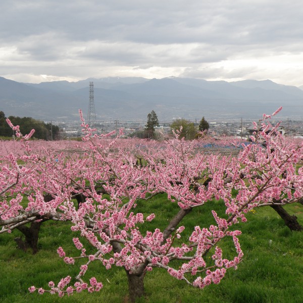 甲府盆地の笛吹市近辺では、桃の花が満開になり、華やかな色に包まれてます。