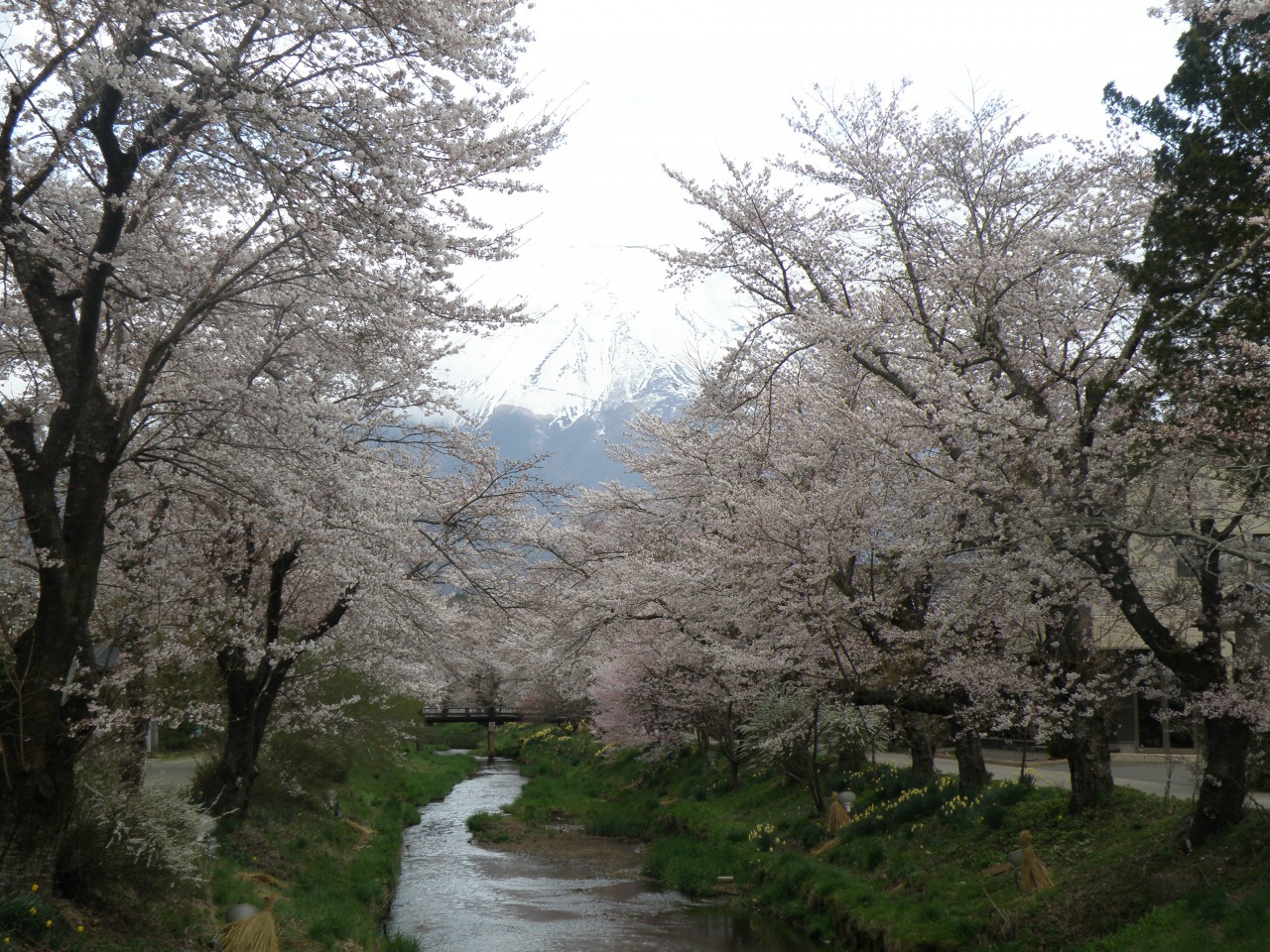 当ペンションから、車で7分程の所のお宮橋では、富士山をバックに桜が満開に!