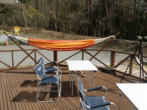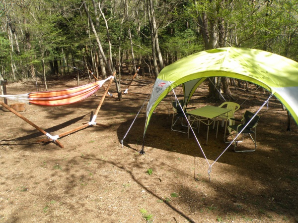 ペンションの森の中にパーティーシェイドー(テント)中心にハンモック・たき火台などグランピングを楽しめる用具を5ヶ所設置しました!