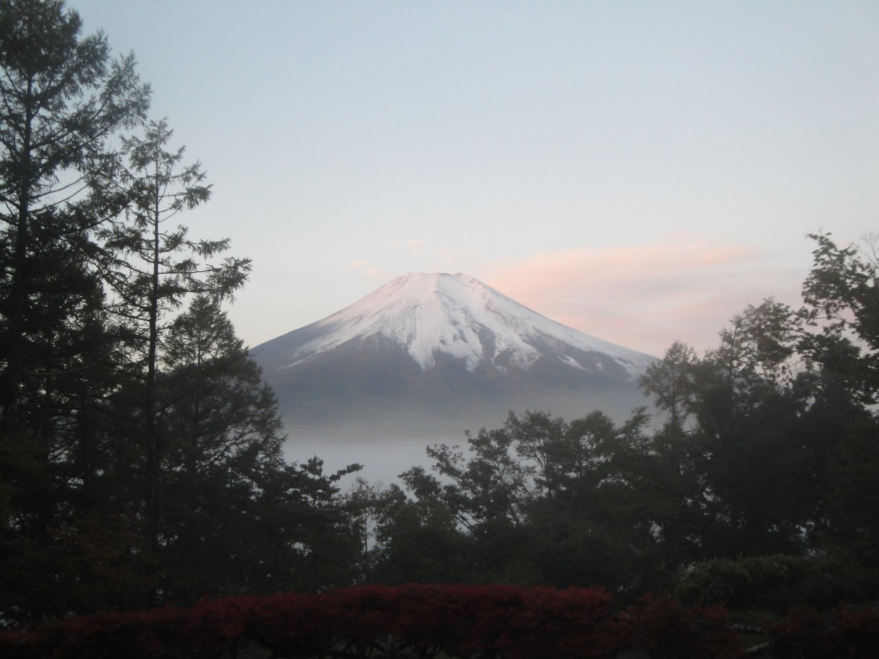 日の出と共にに薄っすらとピンクに染まった富士山!