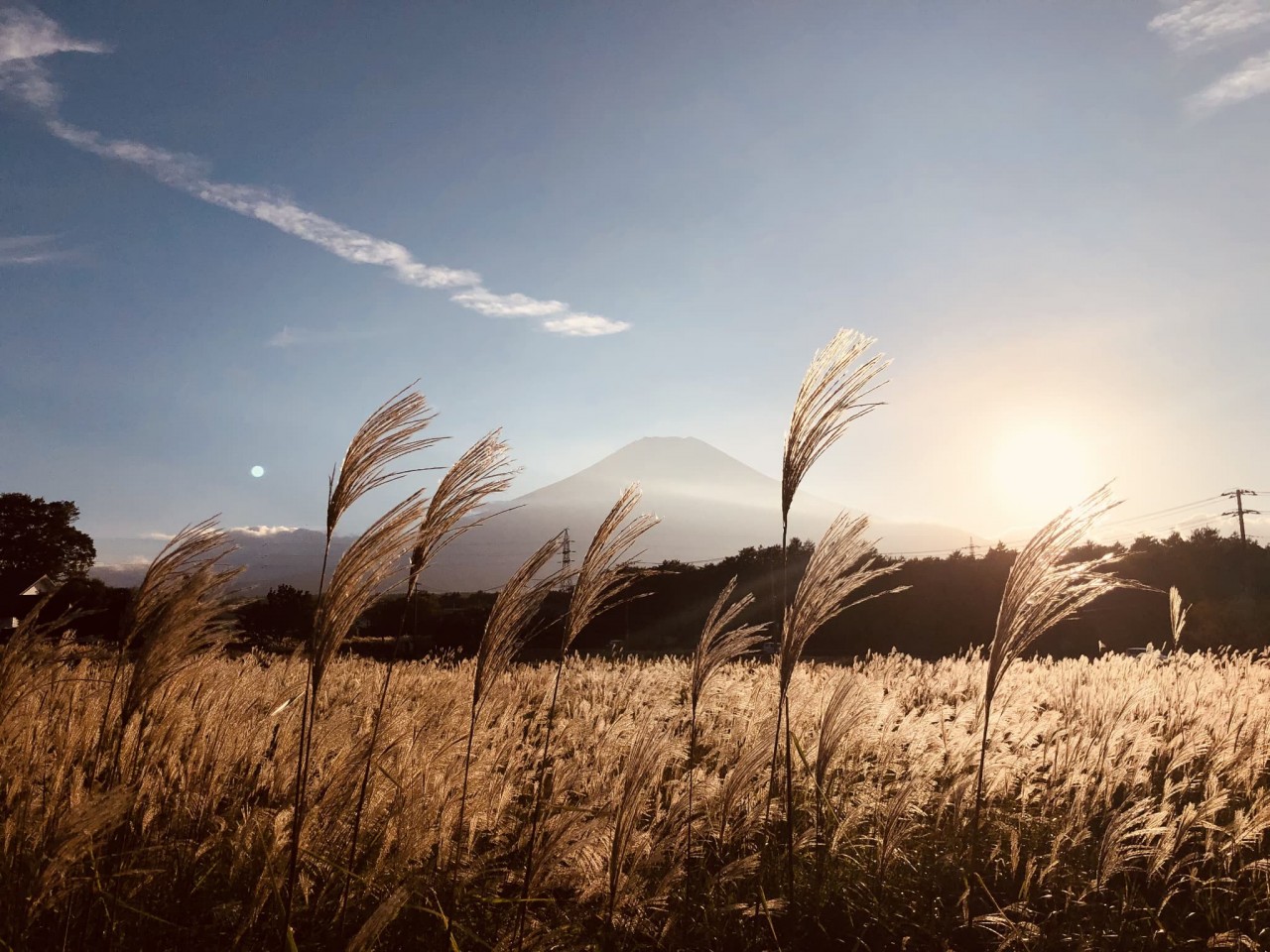 すすきの穂が風に揺れる姿は、まるで黄金の海。富士山をバックにしたこの景色は、つい道ゆく人も足を止めしばし眺めるほど心が和むものです。