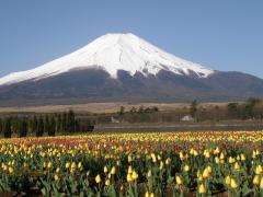 当館近くの花の都公園では、チューリップの見頃を迎え雪化粧の富士山とチューリップの競演が楽しめます。