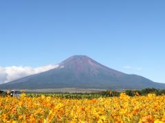 白や桃色のコスモスのほかに、キバナコスモスの花畑がオレンジ色に咲き、花のじゅうたんになっています。