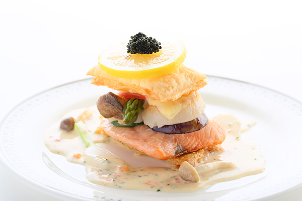 サーモンとホタテのミルフィーユ。お皿を目の前にどうして食べようかと悩んでしまいそうなお料理です。ばっさり真ん中からナイフでどうぞ。パイの香ばしさが広がり、サーモン、ホタテ、野菜のハーモニーをエシャロットソースでいただいてください。トマトとチーズも味のアクセントになり、定番、オリジナルの自慢の一品です。