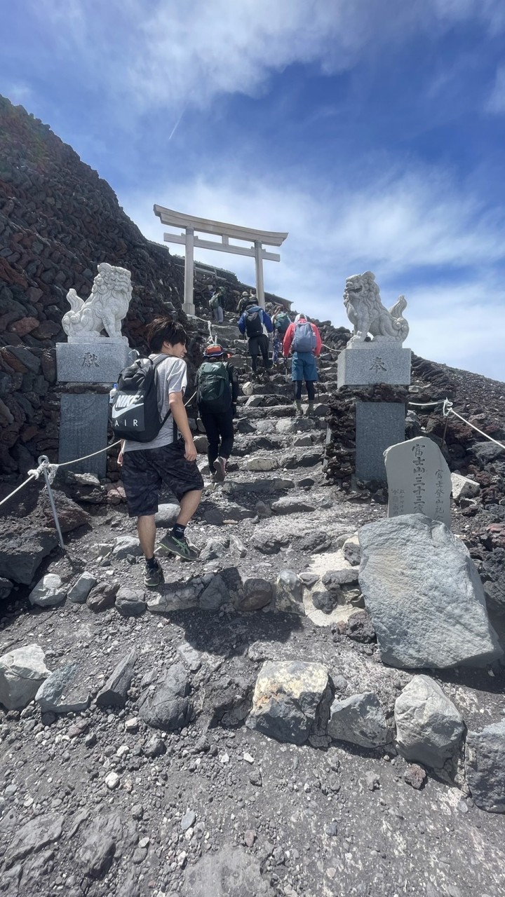頂上手前の鳥居では、狛犬が登山者を迎え入れてくれます。頂上到着時も天候に恵まれ、富士山の頂で見た雲海の広がる景色は改めて心に刻まれる風景となりました。