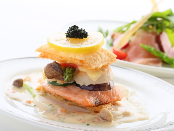 • 魚料理:サーモン・ホタテ・季節野菜とパイのミルフィーユ